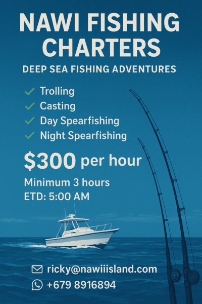 Nawi Island sits in Savusavu Bay on Vanua Levu and is home to the modern Nawi Island Marina, offering access to fishing charters and marine activities.